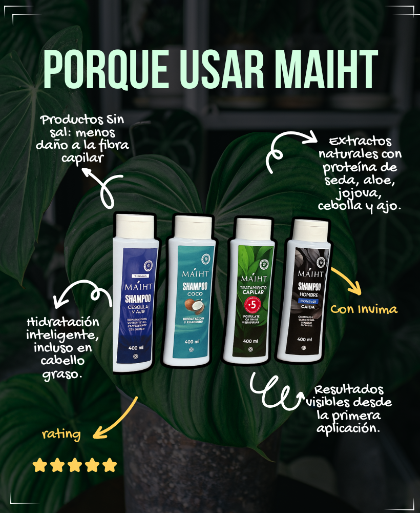 Sabemos que el cuidado capilar de calidad no debería ser solo para celebridades o influencers. Por eso, cada producto Maiht Capilar está hecho con altos estándares y tiene registro INVIMA, pero sin que te duela el bolsillo.